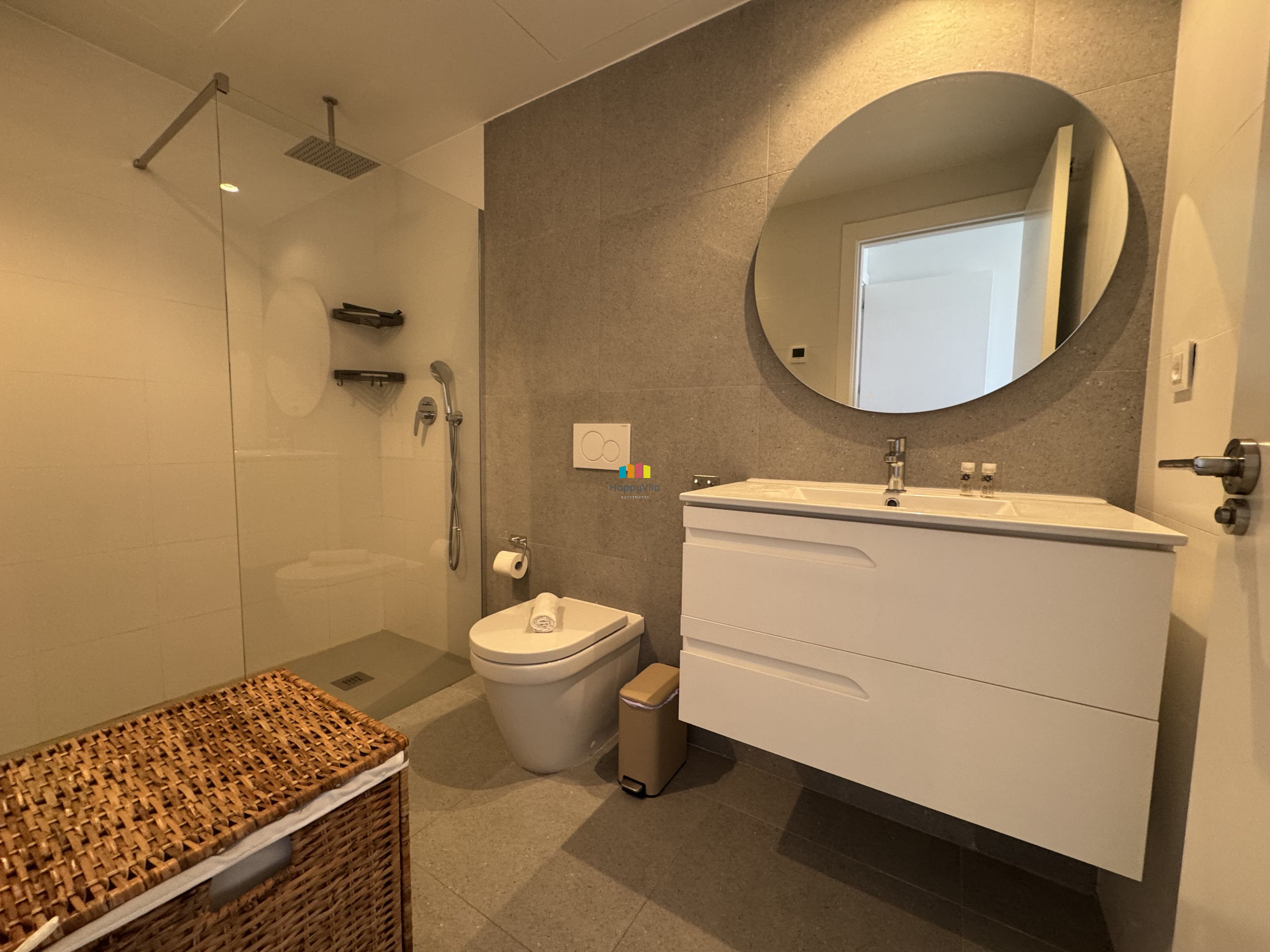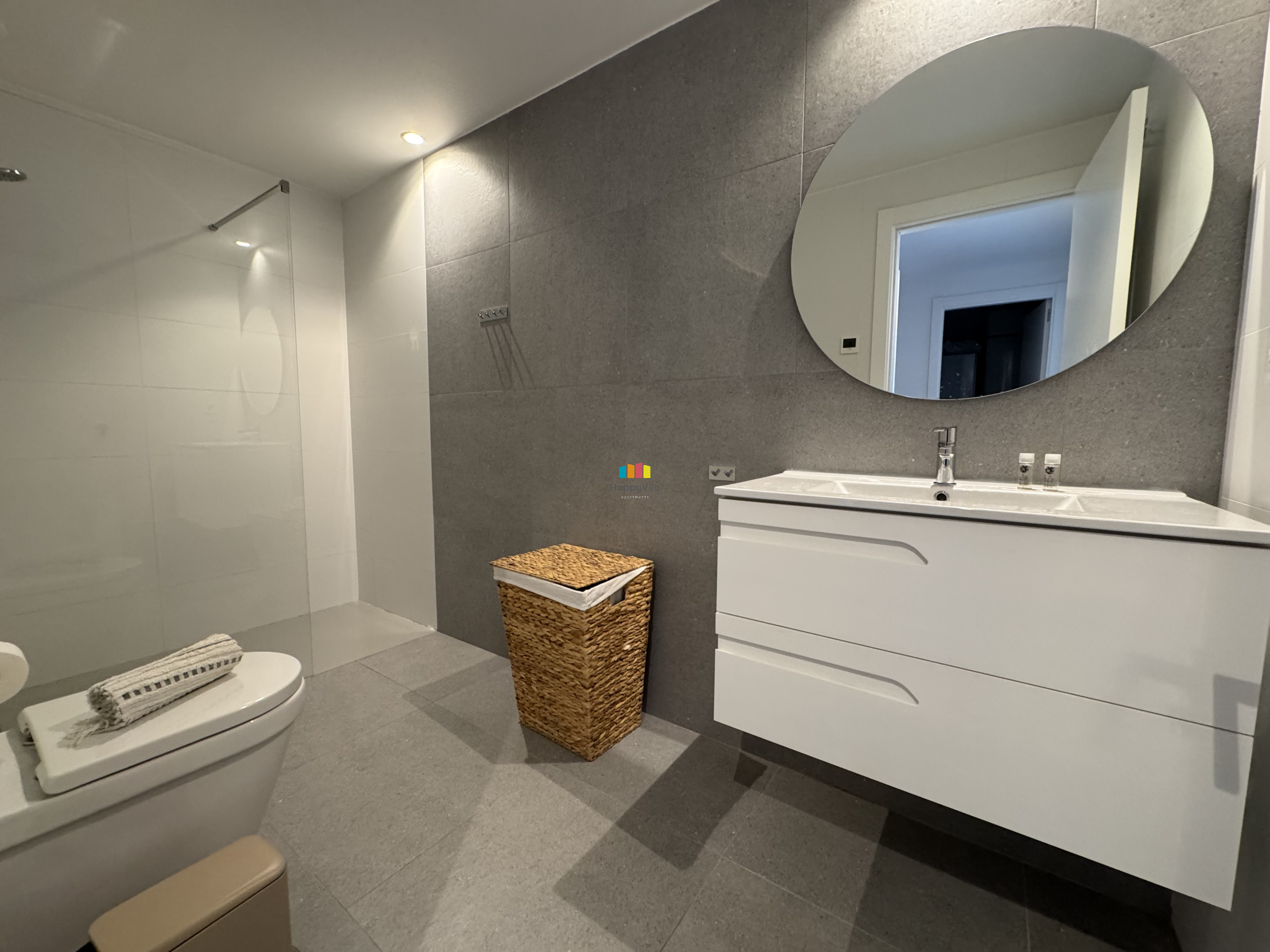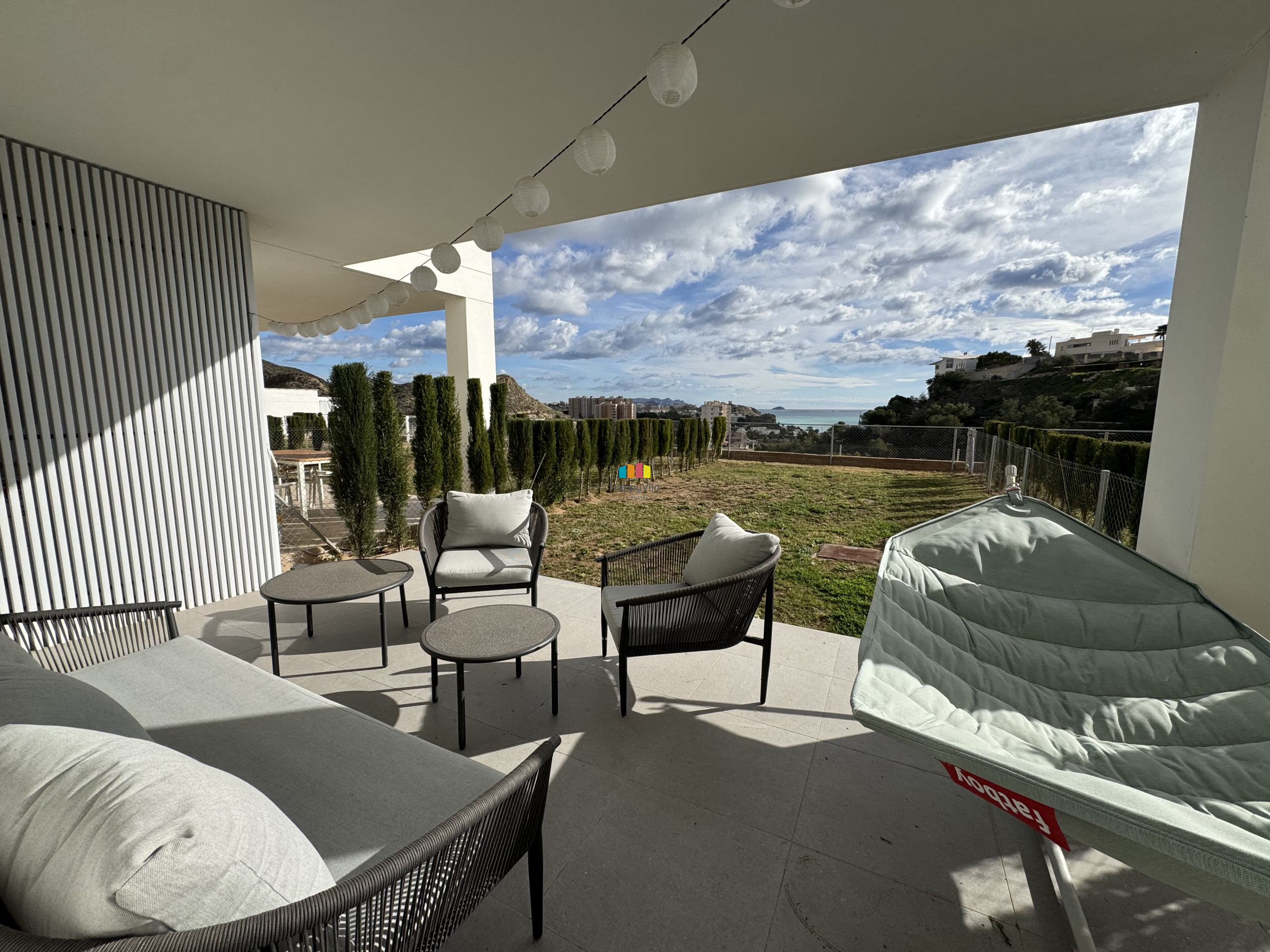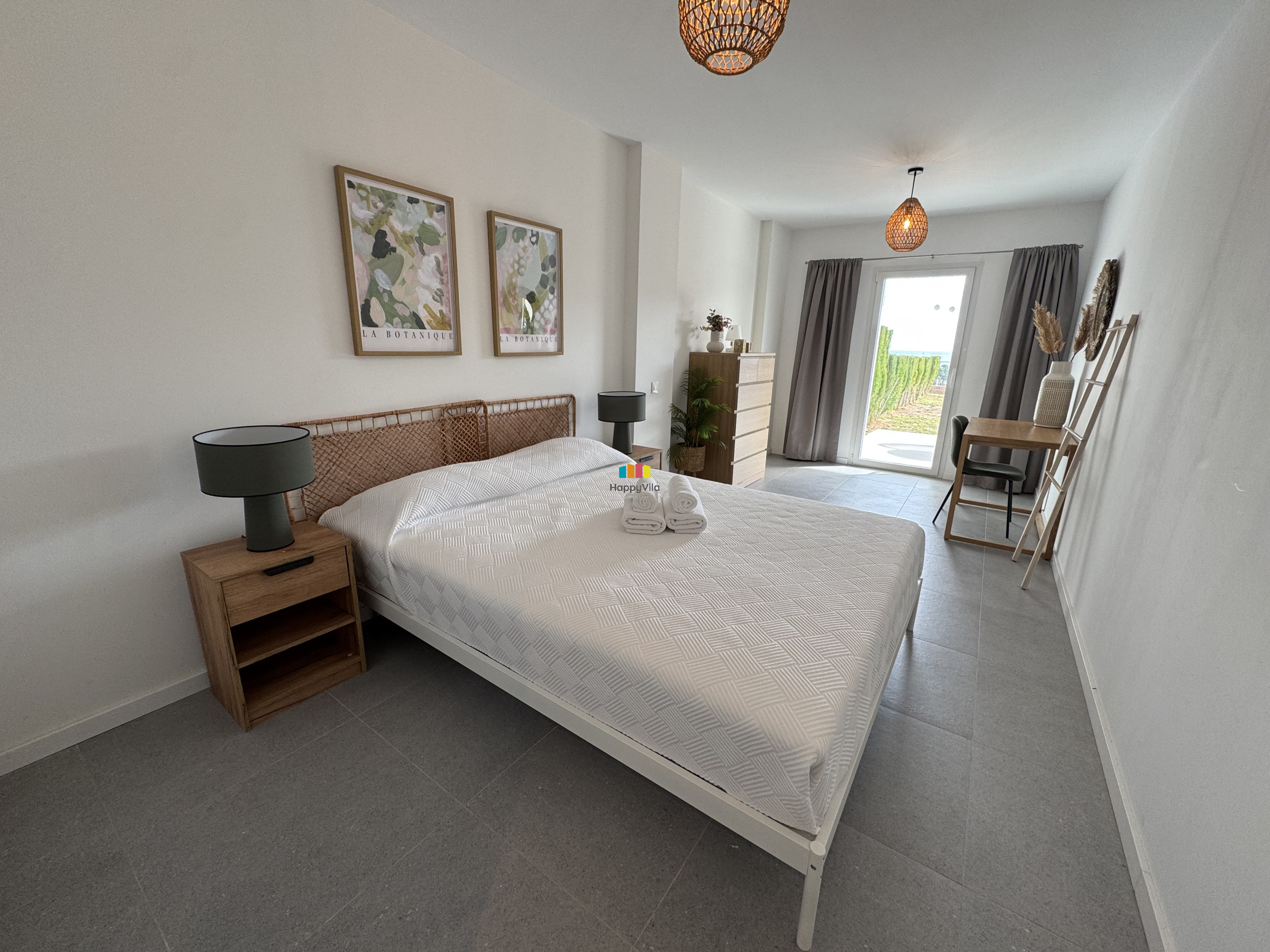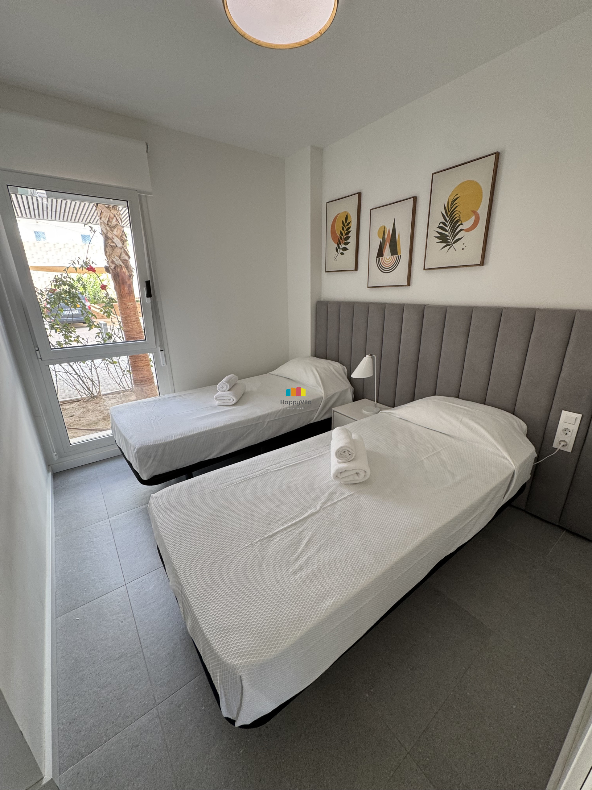 Dispone de jardín, parcela vallada, 20 m² de terraza, lavadora, plancha, acceso internet (wifi), secador, pista de padel, calefacción bomba de calor, aire acondicionado, piscina comunitaria+infantil, parking aire libre en mismo edificio, 1 Televisor.